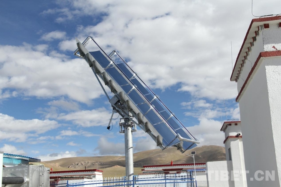 圖為那曲申扎縣申扎鎮(zhèn)姜戎村新居點(diǎn)的巨大太陽(yáng)能為村里澡堂供熱水 攝影:趙釗