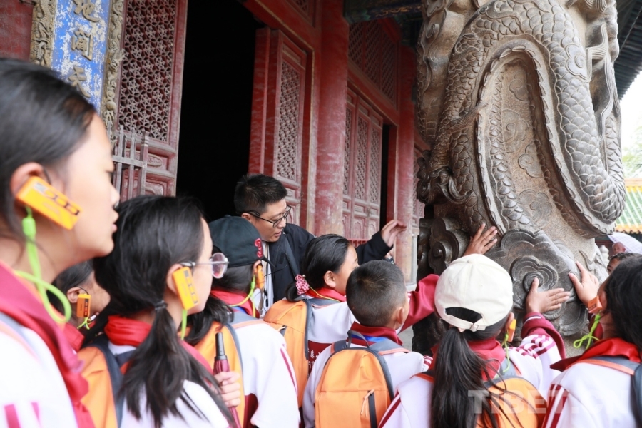 圖為西藏阿里噶爾縣孔繁森小學(xué)的孩子們在山東曲阜孔廟大成殿外用手感受殿外盤龍巨柱透雕工藝 攝影:劉莉