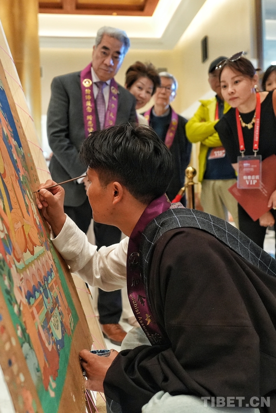 為了提升觀展體驗(yàn),展覽特別設(shè)置了“唐卡技藝現(xiàn)場(chǎng)演示”環(huán)節(jié)。壤巴拉非遺傳習(xí)協(xié)會(huì)青年藝術(shù)家申支足現(xiàn)場(chǎng)展示傳統(tǒng)唐卡繪制過(guò)程,他專注而細(xì)膩的筆觸,讓觀眾得以近距離觀察到非遺技藝的“匠心細(xì)節(jié)”,直觀感受每一幅作品背后所沉淀的時(shí)間與文化心血,從而更深入地理解中國(guó)優(yōu)秀傳統(tǒng)藝術(shù)的創(chuàng)作邏輯。