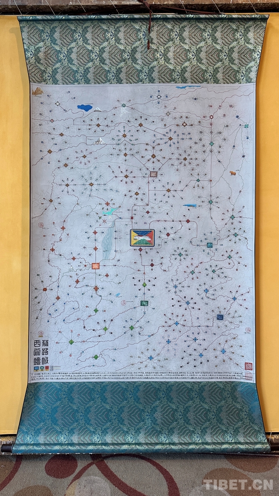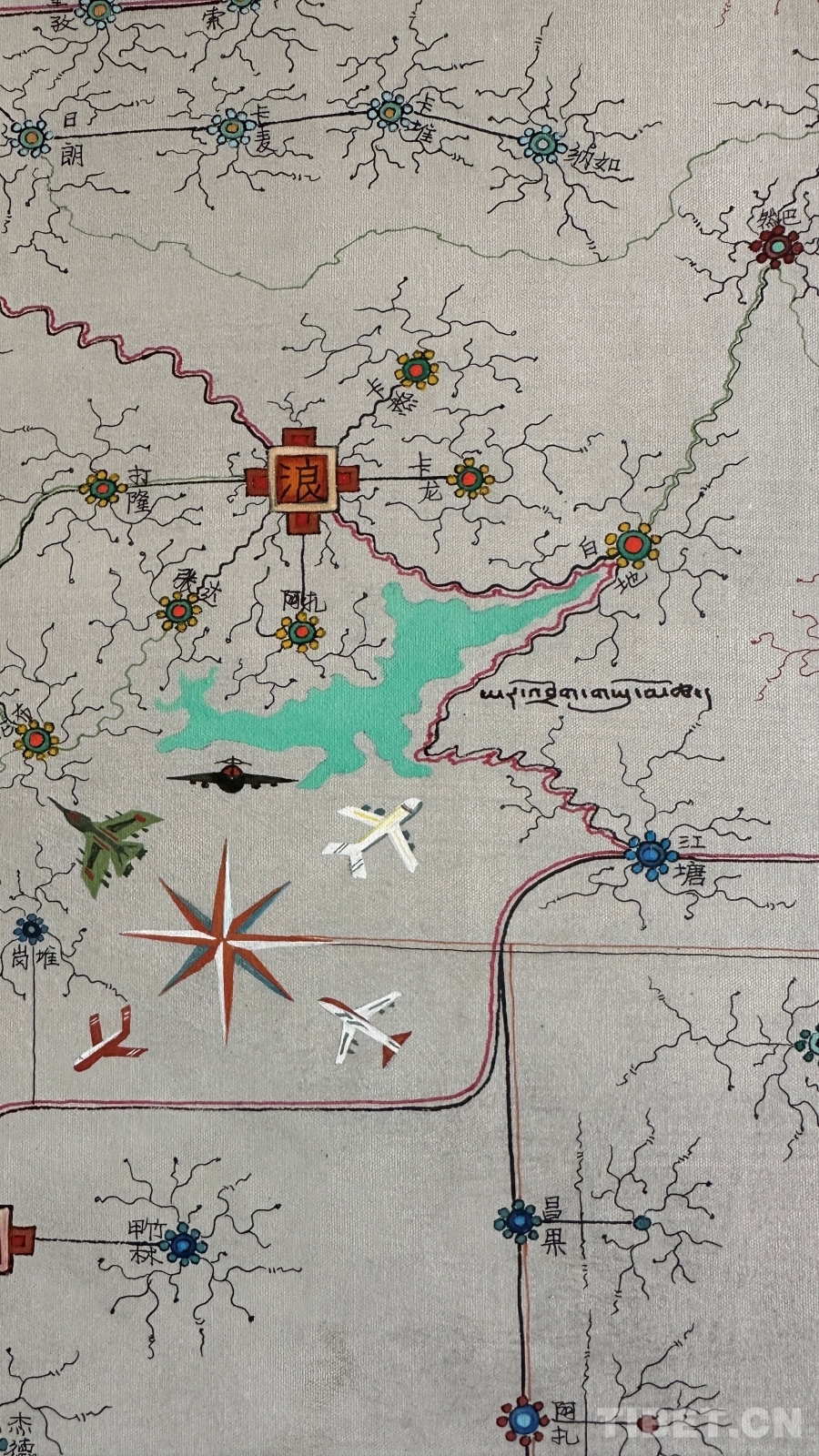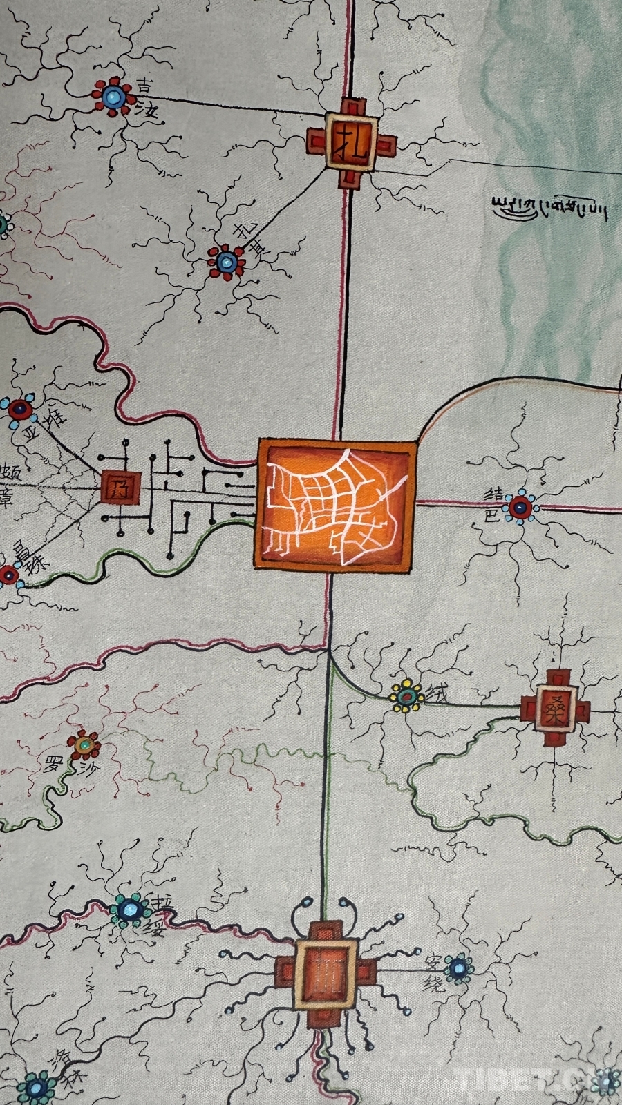 達(dá)布詳細(xì)解釋了這幅唐卡的圖像系統(tǒng):正方形代表市、區(qū),內(nèi)部畫(huà)有該市區(qū)主干道地圖;十字方形代表縣;圓形寶石形代表鄉(xiāng)鎮(zhèn);藏文“嗡”字代表名勝古跡;此唐卡以黑線為所有公路基礎(chǔ)線,黑線邊上的紅黃線代表國(guó)道和高速,綠線代表省道,黑細(xì)線代表縣鄉(xiāng)鎮(zhèn)及村級(jí)公路。沿途還繪制了珠峰、古格王國(guó)遺址、納木錯(cuò)等代表性景點(diǎn),并用藏文標(biāo)注名稱。