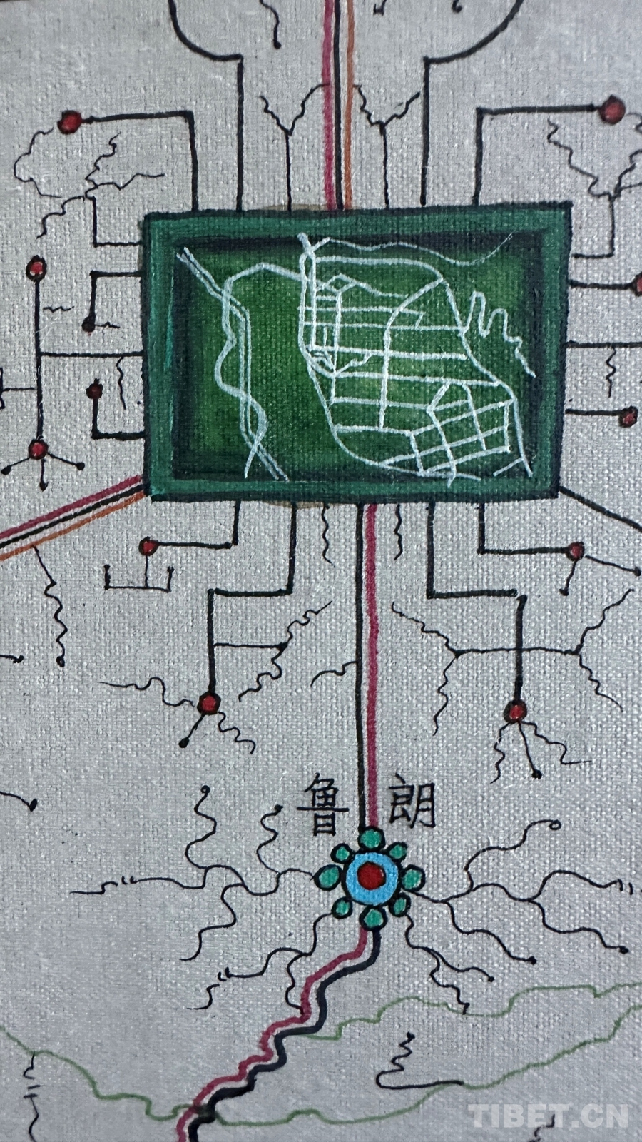 創(chuàng)作過(guò)程中最大的困難是如何藝術(shù)地表現(xiàn)公路網(wǎng)絡(luò)?!拔彝ㄟ^(guò)分析現(xiàn)代地圖、衛(wèi)星導(dǎo)航、古代寶藏圖和手繪地圖,發(fā)現(xiàn)西藏公路是順應(yīng)地貌修建的。”達(dá)布描述著他的發(fā)現(xiàn),“沿著河流,一條河有幾個(gè)分支就有幾條路;沿著山谷,一個(gè)大山谷有幾個(gè)小山溝就有幾條路。俯看就像一棵大樹(shù),又像是電腦芯片,一條主干道邊上分出無(wú)數(shù)支線?!?nbsp;