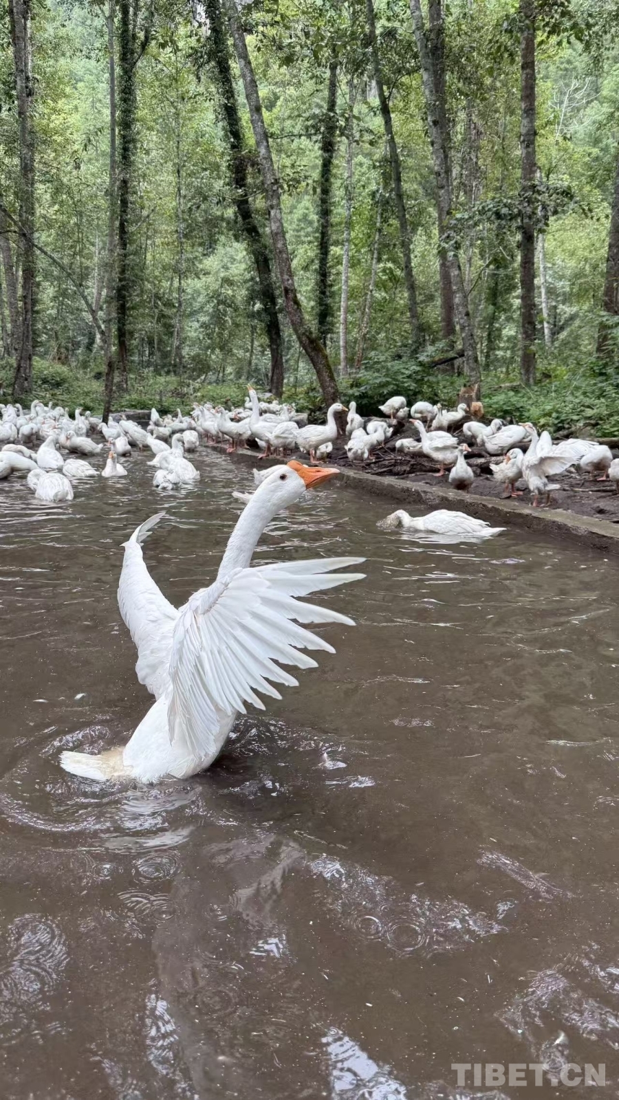 “嘎嘎——!”清晨,察隅的山霧還沒散盡,上察隅鎮(zhèn)珠聯(lián)村的山林間,上千只大白鵝已經(jīng)吵成一片。這些圓滾滾的“白團子” ,或撲棱著翅膀在水塘中嬉戲,引吭高歌;或憨態(tài)可掬地在林間來回踱步,啄食雜草……把這個2024年10月才成立不久的搬遷新村,攪得熱鬧非凡。