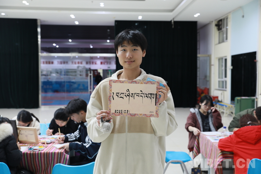 圖為2024級公共管理專業(yè)的楊乘鶴同學(xué)展示他在藏文書法體驗(yàn)環(huán)節(jié)創(chuàng)作的作品。攝影:畢然