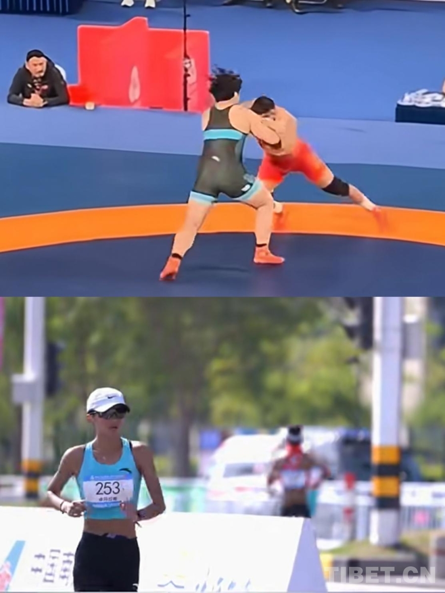視頻截圖為西藏摔跤運(yùn)動(dòng)員洛松西繞(上)和競走運(yùn)動(dòng)員卓瑪拉姆(下)在比賽中