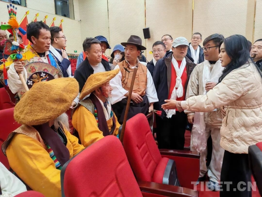 在南木林縣湘巴文化藝術(shù)中心內(nèi),南木林鎮(zhèn)雪藏戲隊(duì)的演員們頭戴色彩鮮艷的五彩面具,將經(jīng)典藏戲《智美更登》選段演繹得蕩氣回腸。高亢唱腔極具穿透力,粗獷又滿含張力的舞步踏在舞臺(tái)上,每一步都踩出湘巴藏戲的獨(dú)特韻味。接著,《格薩爾說唱》的雄渾敘事、《土布加諧慶》的歡快韻律、《扎木念》的悠揚(yáng)曲調(diào)一一上演,一場非物質(zhì)文化遺產(chǎn)的盛宴令調(diào)研組成員陶醉。他們的手機(jī)鏡頭緊緊追隨演員,將精妙的表演、動(dòng)人的唱腔定格。表演間隙,調(diào)研組的藝術(shù)家們與演員圍坐在一起,圍繞表演技巧展開深入交流,探討唱腔中氣息的綿長運(yùn)用,研究舞步里節(jié)奏的細(xì)微變化。在思想的碰撞中,藏戲藝術(shù)的傳承創(chuàng)新脈絡(luò)愈發(fā)清晰。