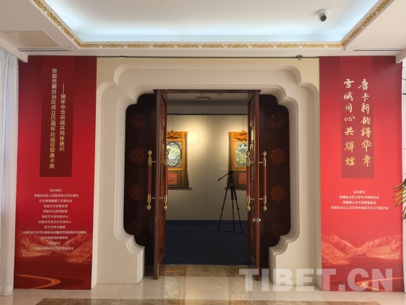 圖為“唐卡新韻譜華章 雪域同心共輝煌——鑄牢中華民族共同體意識”致敬西藏自治區(qū)成立60周年壯麗征程唐卡展展廳