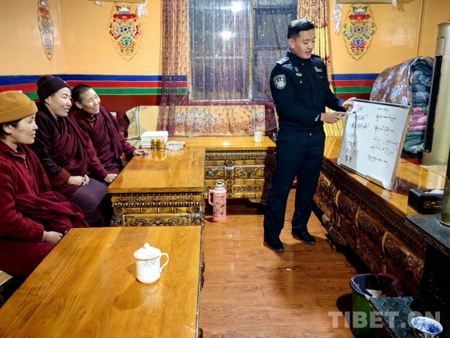 圖為民警更丁丁久為帕巴寺尼姑們開展國家通用語言文字學(xué)習(xí)培訓(xùn)