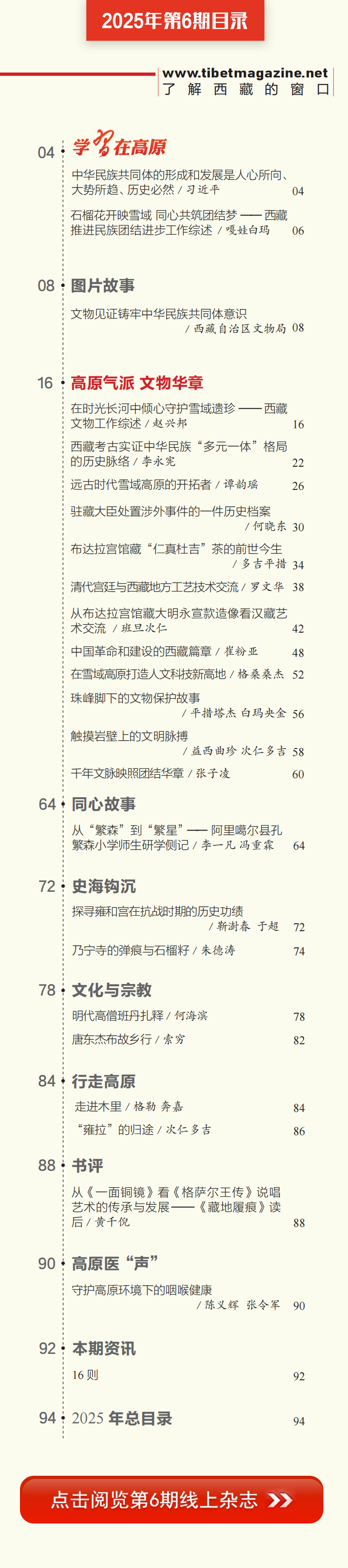 歲聿云暮,秋收冬藏?!吨袊?guó)西藏》漢文版2025年第6期如期與讀者見面了,本期雜志是西藏文物???,得到了西藏自治區(qū)文物局、故宮博物院的大力支持,集納了有關(guān)文稿13篇、圖片90余幅,從文物考古角度追溯各民族交往交流交融的歷史,展現(xiàn)青藏高原文明崛起與民族融合的壯麗詩(shī)篇。