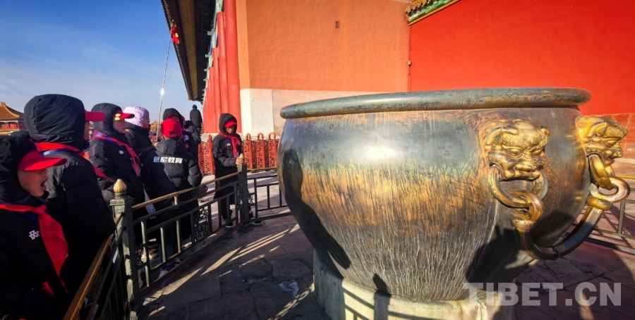 圖為西藏自治區(qū)那曲市色尼區(qū)青少年足球隊赴京研學(xué)團的孩子們在了解故宮里以大銅缸為代表的消防設(shè)施 攝影:劉莉