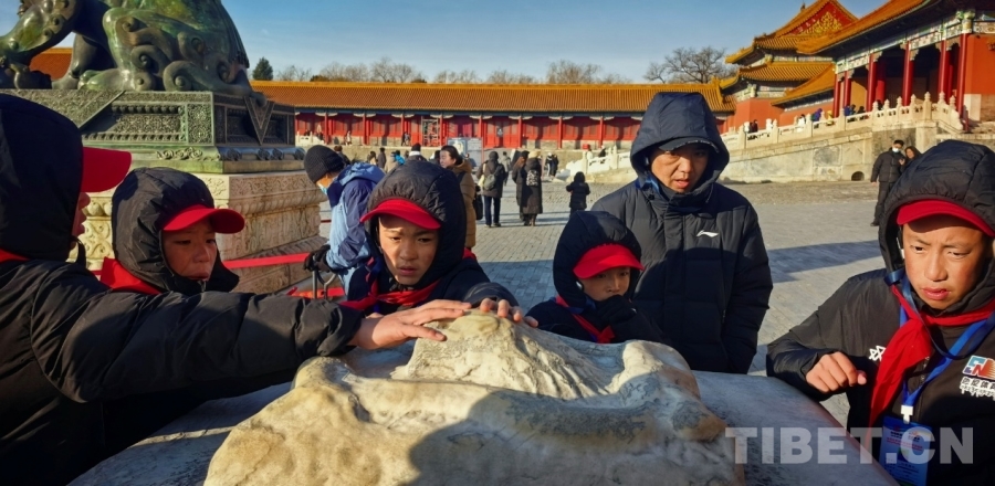 圖為西藏自治區(qū)那曲市色尼區(qū)青少年足球隊赴京研學(xué)團的孩子們感受故宮古老的石刻 攝影:劉莉