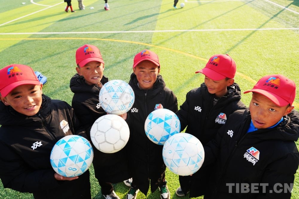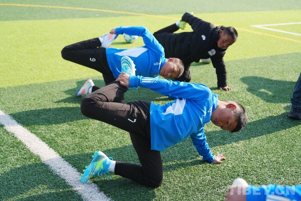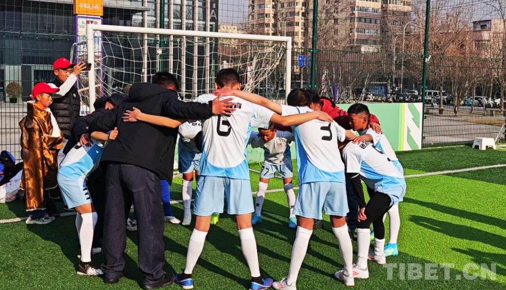 盡管正值寒冬,西藏的足球少年們已經(jīng)迫不及待地?fù)Q上球服開始跑動熱身。帶隊教練和球員們圍成圓圈,團(tuán)抱在一起,大喊加油!