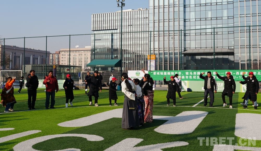 賽前儀式上,雙方球員列隊入場,西藏球員為北京球員獻(xiàn)上潔白的哈達(dá),雙方輕觸拳面,彼此加油鼓勁。隨著裁判一聲哨響,比賽正式開始。綠茵場上,球員們盡情奔跑,汗水滴落紅彤彤的臉龐,呼出的氣息在寒冷的空氣中化作白霧,眼睛里卻裝滿對足球運(yùn)動的認(rèn)真和熱愛。