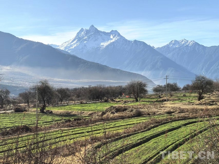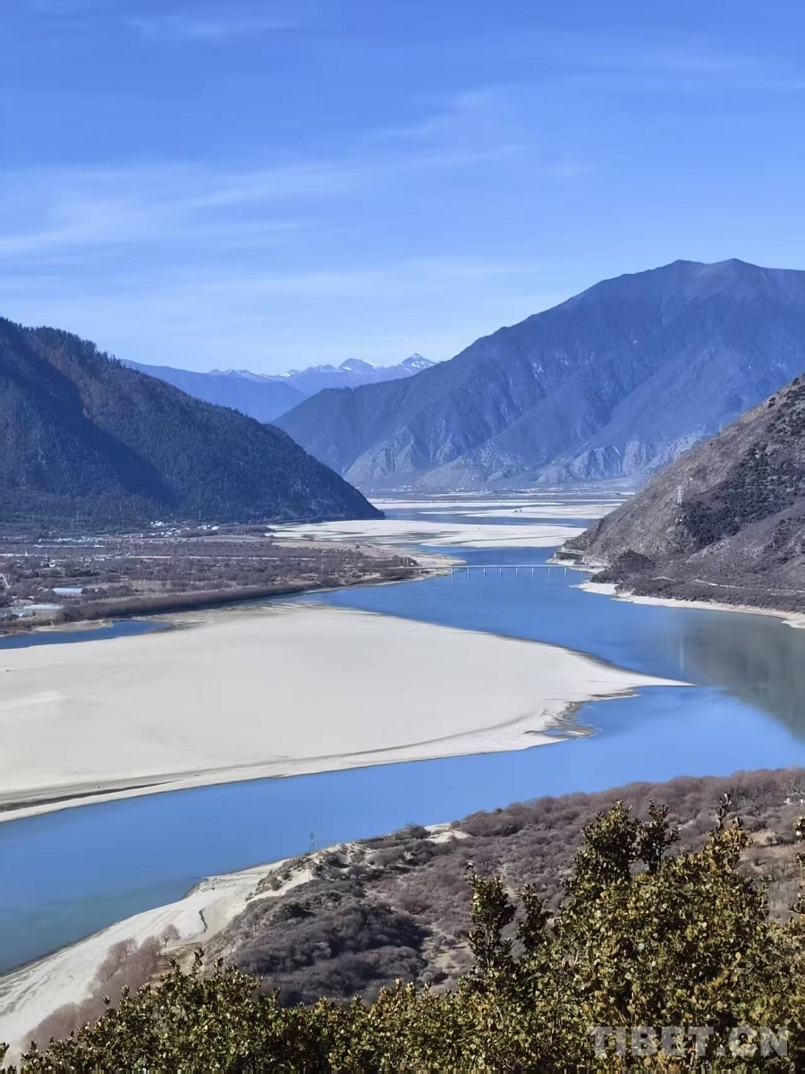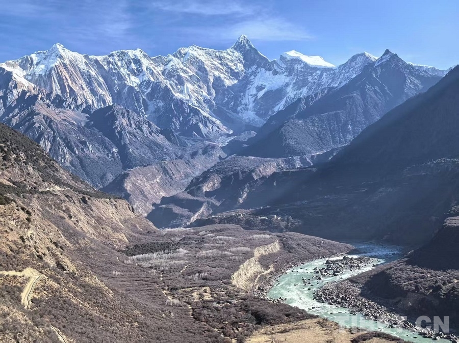 冬日,雅魯藏布大峽谷靜默如詩(shī)。江水凝為碧藍(lán)玉帶,蜿蜒穿行山間。驅(qū)車沿山路前行,掠過田舍與松林,驀然抬首,巍峨雪山撲面而來——陽(yáng)光璀璨,峰巔銀光灼灼,在蔚藍(lán)天空下愈顯玉潔冰清。