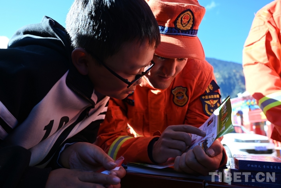 圖為指戰(zhàn)員給小朋友講解防火知識(shí) 攝影:仁青旺堆