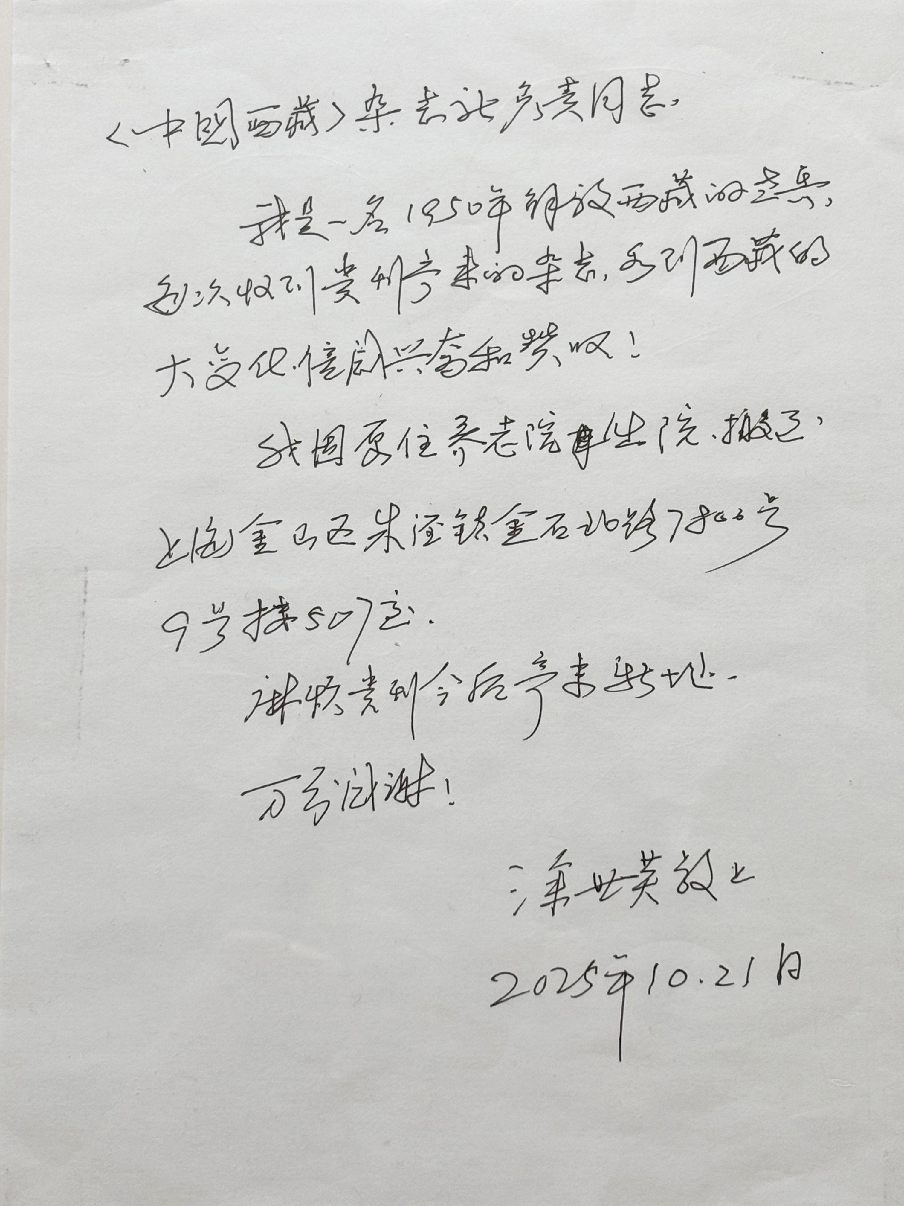 涂世英老先生,見字如面。您的來信,《中國西藏》雜志編輯部已完整收悉,心中滿是敬意與溫暖。我們深知,您是1950年便投身于解放西藏偉大事業(yè)的老兵,是雪域高原和平解放的親歷者、見證者,是用青春與熱血守護這片土地的先行者。歲月流轉(zhuǎn),您始終未曾放下對西藏的牽掛,每一次收到本刊,都為這片高原翻天覆地的變化感到由衷興奮和贊嘆。這份跨越時光的關注,讓我們每一位編輯都深受觸動。