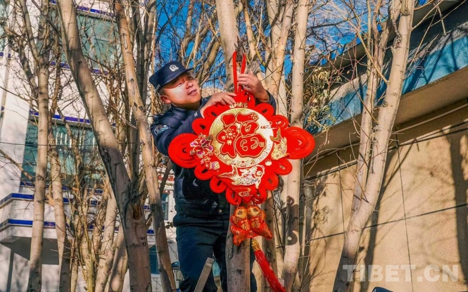 “來(lái)來(lái)來(lái),搭把手!把這個(gè)中國(guó)結(jié)掛高點(diǎn),看著喜慶!” 教導(dǎo)員楊曦淙踩著凳子將手中的中國(guó)結(jié)高高地掛在了樹(shù)上,新警吳措多杰在下面扶著梯子,仔細(xì)調(diào)整著高度。另一邊,民警們?nèi)宄扇海械哪弥鴿{糊貼對(duì)聯(lián),有的忙著掛彩燈,營(yíng)區(qū)的每一個(gè)角落都被點(diǎn)綴得喜氣洋洋。