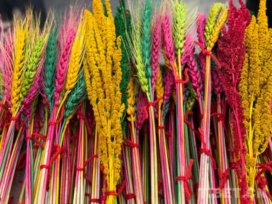 圖為藏年花,藏語(yǔ)稱(chēng)為“羅薩梅朵”,是用麥穗染成藍(lán)、黃、綠、紅等顏色,寓意豐收美滿(mǎn)。