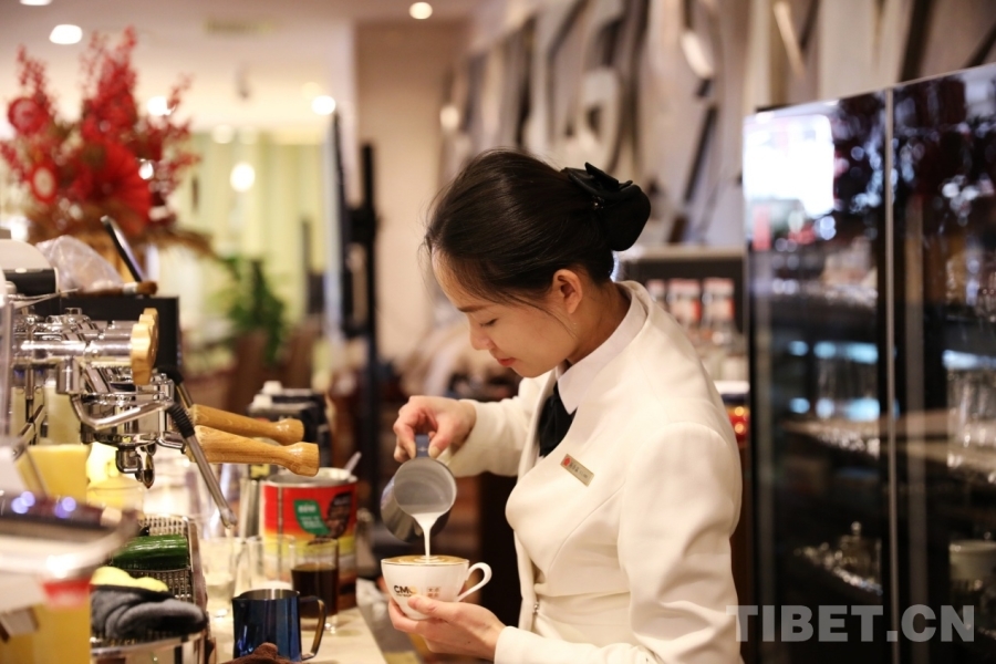 2026年全國兩會(huì)新聞中心茶歇處飲品吧工作人員正在為咖啡拉花 攝影:劉莉