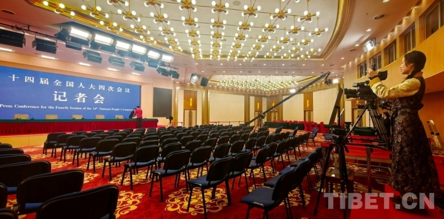 中國(guó)西藏網(wǎng)記者正在拍攝2026年全國(guó)兩會(huì)新聞中心工作人員布置新聞發(fā)布廳 攝影:劉莉
