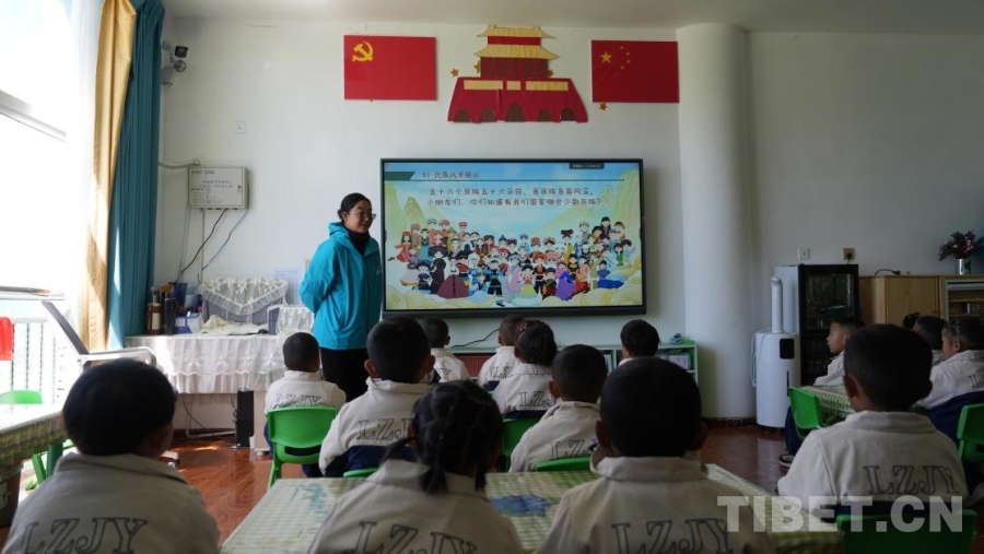 在西藏日喀則市拉孜縣第二幼兒園中(1)班教室里,老師郁瓊珠姆話音剛落,孩子們的回答便齊聲響起,清脆而堅(jiān)定。屏幕上,56個(gè)民族的卡通形象匯聚于一幅畫(huà)之中。她接著問(wèn)道:“那我們國(guó)家遼闊的土地上,生活著多少個(gè)民族?”一只只小手高高舉起,搶答聲此起彼伏:“56個(gè)!”對(duì)孩子們而言,這些答案已經(jīng)成為日常學(xué)習(xí)生活中耳濡目染的常識(shí)。