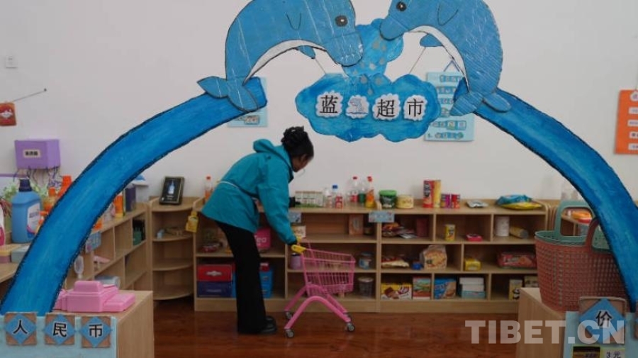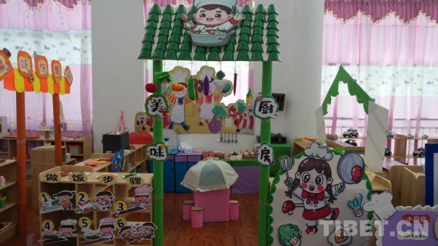 活動(dòng)室內(nèi),分區(qū)域模擬了娃娃家、警察局、理發(fā)店、小廚房、超市、醫(yī)院等生活場(chǎng)景?!按蟛糠中∨笥堰€處于不識(shí)字的階段,所以我們盡量用圖片等形式幫助他們理解每個(gè)場(chǎng)景、每個(gè)步驟?!痹谶@個(gè)手工打造的小小“社區(qū)”里,孩子們通過(guò)角色扮演,模擬超市選購(gòu)與結(jié)賬、醫(yī)院掛號(hào)就醫(yī)、照顧家庭成員、理發(fā)、烹飪等生活場(chǎng)景。如果發(fā)現(xiàn)其他小朋友的“不良”行為,甚至可以前去“警察局”按流程“報(bào)案”。不同于其他的商業(yè)化兒童場(chǎng)景模擬體驗(yàn)區(qū)域,拉孜縣第二幼兒園活動(dòng)室的道具大部分由教師們制作而成,手工打造的8個(gè)模擬場(chǎng)景盡顯用心和細(xì)致。