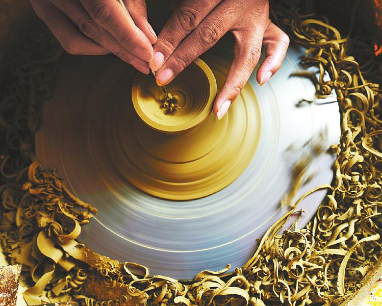 飛轉(zhuǎn)的泥坯上折射出金色的光芒,學員刻苦學習拉坯的技藝。