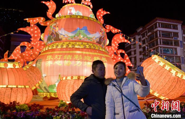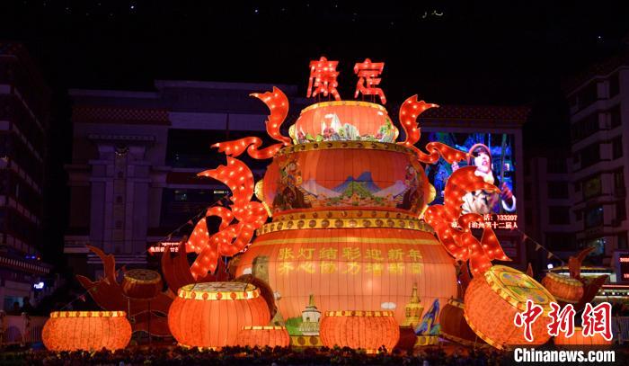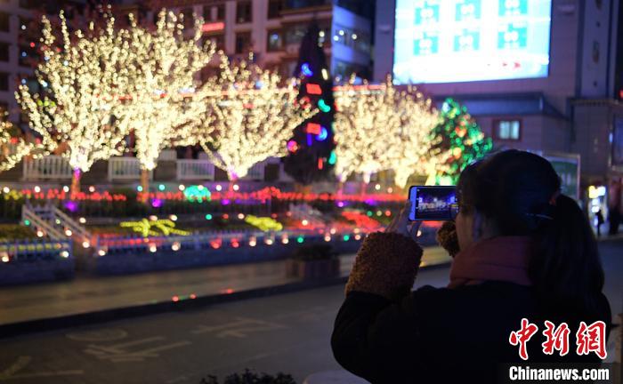 1月16日,新春將至,四川甘孜康定市街頭大型迎春彩燈、霓虹燈投用,夜幕下絢爛的光影吸引了不少民眾目光。