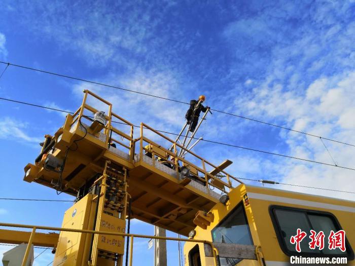 圖為中國(guó)鐵路青藏集團(tuán)有限公司西寧供電段格爾木接觸網(wǎng)大修工區(qū)的接觸網(wǎng)工在檢修接觸網(wǎng)。周賀 攝