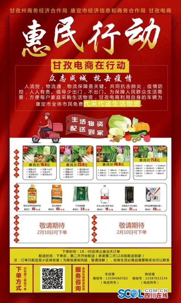 據(jù)悉,這是四川省甘孜州商務(wù)和經(jīng)濟(jì)合作局為配合防疫工作,降低市民出行交叉感染的幾率,聯(lián)合康定市經(jīng)合局、爐城和榆林2個(gè)街道辦9個(gè)社區(qū)、圣潔甘孜扶貧超市、康定民貿(mào)公司、康定鄰你超市、順豐甘孜快遞等企業(yè)和單位,為居住在康定新老城區(qū)的居民,專門開展的“防疫套餐”送貨上門惠民行動(dòng)。