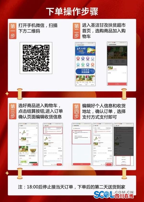 “防疫套餐”送貨上門惠民行動(dòng)從2月9日開始試運(yùn)行,2月10日第一批蔬菜貨物正式送到家。家住在康定市新老城區(qū)的市民,只需通過掃描電子宣傳單的二維碼,進(jìn)入圣潔甘孜扶貧超市首頁,選購商品加入購物車,點(diǎn)擊結(jié)算,進(jìn)入訂單確認(rèn)頁面編輯收貨信息,之后確認(rèn)訂單選擇支付方式支付即可。當(dāng)天下單,最遲第二天就能在家免費(fèi)收貨。