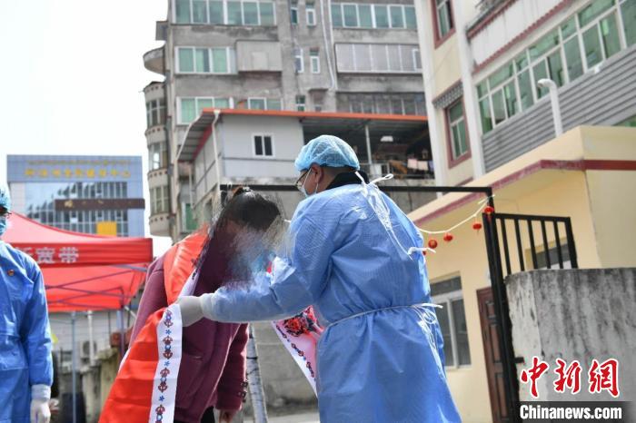 醫(yī)護人員向郭某某送上鮮花?!≈芡?攝