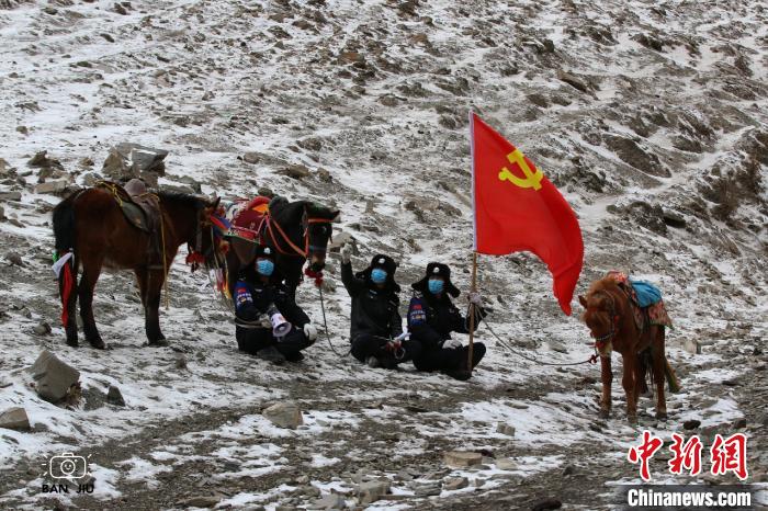圖為馬背巡邏隊在轄區(qū)內(nèi)為牧民贈送口罩、發(fā)放藏漢雙語宣傳資料?!≡魈m周 攝