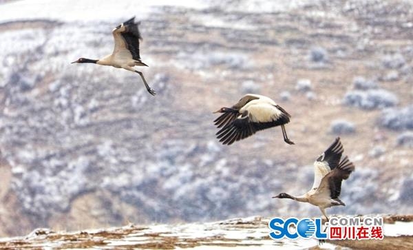 3月16日,在四川省阿壩州紅原縣安曲鎮(zhèn)的草原濕地,到處是雪茫茫的一片,從云南、貴州等地越冬歸來的一群黑頸鶴在此嬉戲覓食。它們時而逐嬉鬧,時而展翅飛翔,與周邊的牦牛、赤麻鴨相映成趣,給沉寂的高原帶來無限生機和活力。