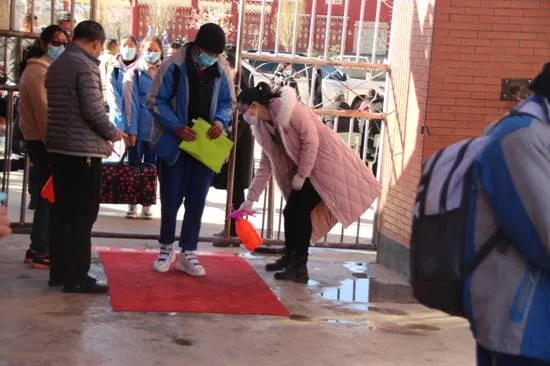 早晨八點(diǎn)三十分,學(xué)生陸續(xù)到校,學(xué)校各部門(mén)按照前期演練的程序有序組織學(xué)生進(jìn)校。班主任在學(xué)生整隊(duì)等待區(qū)整隊(duì)、學(xué)生遞交返校監(jiān)控資料、鞋底消毒、手部消毒、領(lǐng)取新口罩、回收舊口罩、體溫檢測(cè)、洗手、入班再檢測(cè)體溫、宣講新型冠狀病毒感染肺炎防控知識(shí),各個(gè)環(huán)節(jié)緊湊有序。185名高三學(xué)生沒(méi)有出現(xiàn)任何身體不適和體溫異常情況,實(shí)現(xiàn)了有序安全返校。