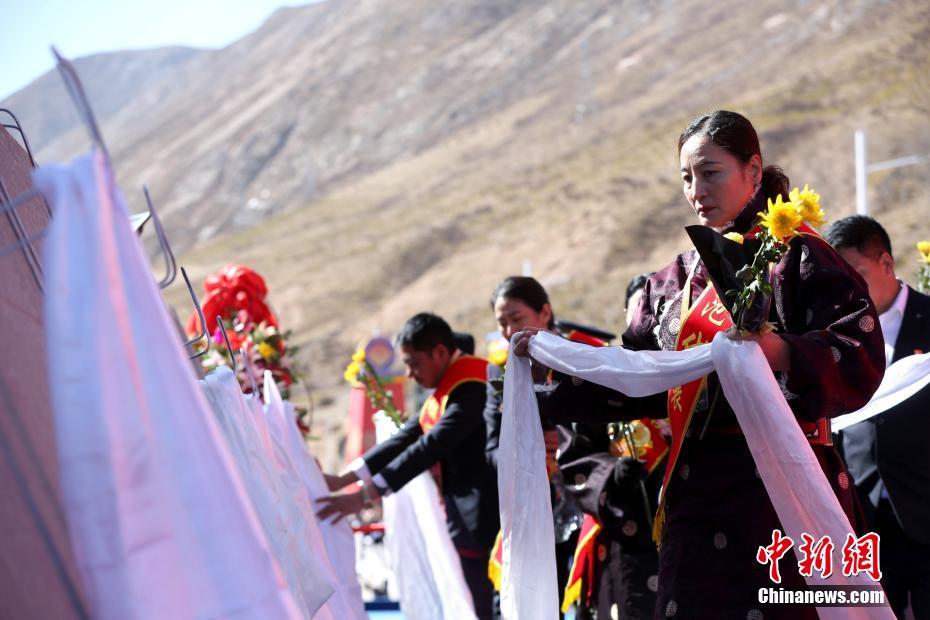 圖為民眾手捧哈達(dá)和鮮花緬懷犧牲英烈及罹難同胞。中新社記者 張?zhí)砀?攝