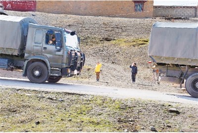 車隊(duì)行駛途中,沿線藏族兒童向軍車敬禮。干亞?wèn)| 攝