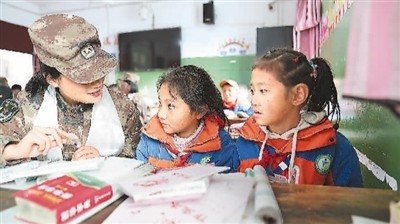 任務(wù)途中,官兵來(lái)到沿線藏族中學(xué),與孩子們做游戲、輔導(dǎo)功課,開(kāi)展國(guó)防教育,讓愛(ài)灑滿雪域高原。郭宏 攝