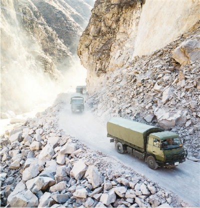 執(zhí)行任務(wù)時(shí)通過(guò)滾石區(qū)的車隊(duì)。沈奧 攝