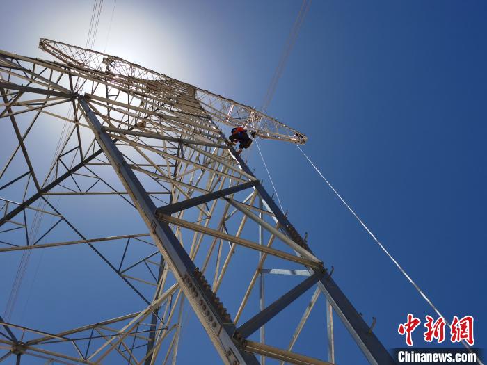 圖為5月17日,檢修人員在海拔5700多米的五道梁檢修“電力天路”?!≈x莉蓉 攝