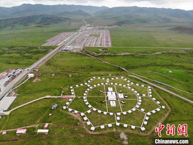尕秀村的帳篷城由108頂大小各異的藏式風格帳篷組成??罩懈╊豁旐攷づ袢缤活w顆璀璨的珍珠,點綴著曬銀灘草原的秀美。楊艷敏 攝