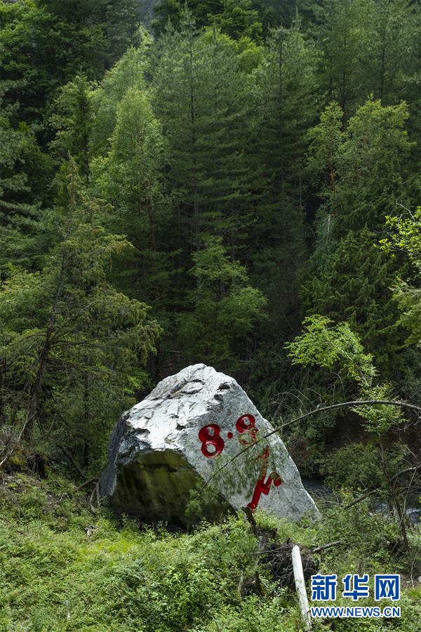這是九寨溝風(fēng)景名勝區(qū)內(nèi)的“8·8石”(6月18日攝)。地震中,這塊高約9.2米、重約522噸的巨石從海拔2654米的山體滾落至河谷,垂直落差達(dá)272米。此石為白云質(zhì)灰?guī)r,形成于3.2億年前的海洋環(huán)境,見(jiàn)證了九寨溝的滄桑變遷。新華社記者 沈伯韓 攝
