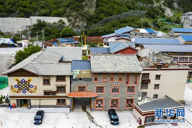 四川省阿壩藏族羌族自治州九寨溝縣漳扎鎮(zhèn)新建的用于旅游接待等功能的藏式風(fēng)格民居(無(wú)人機(jī)照片,6月18日攝)。新華社記者 沈伯韓 攝