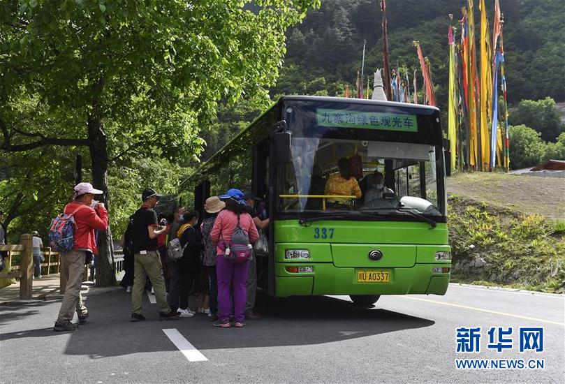 游客在九寨溝景區(qū)內(nèi)乘坐觀(guān)光車(chē)(6月18日攝)。新華社記者 劉坤 攝