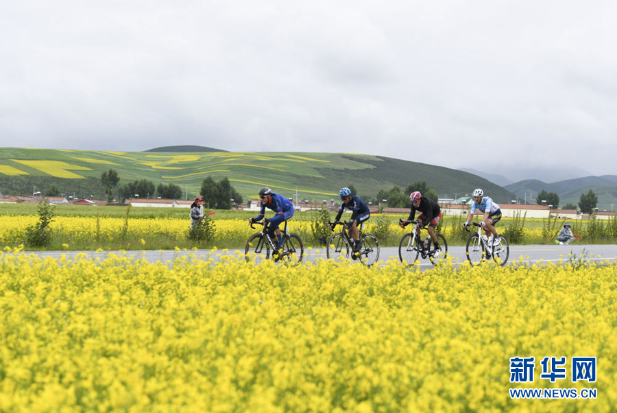 2019年7月21日,車(chē)手們?cè)诒荣愔序T行。當(dāng)日,第十八屆環(huán)青海湖國(guó)際公路自行車(chē)賽展開(kāi)第八賽段——西海鎮(zhèn)到青石嘴的角逐。新華社 張龍 攝
