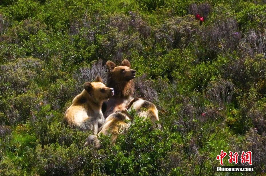 7月13日下午,記者下鄉(xiāng)采訪途中,在海拔4500米的四川省甘孜藏族自治州石渠縣蒙宜鎮(zhèn)蒙格村附近一處水草豐茂的山坡處拍攝時(shí),偶然發(fā)現(xiàn)一只棕熊媽媽曬著陽光浴給三只小熊喂奶場景,棕熊媽媽喂奶結(jié)束后領(lǐng)著小熊寶寶們緩慢走向大山深處。