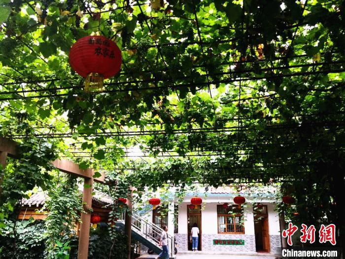 7月,中新網(wǎng)記者走進(jìn)韓謝軍的農(nóng)家樂(lè),庭院中滿(mǎn)是掛滿(mǎn)果實(shí)的葡萄架長(zhǎng)廊,葡萄枝葉連成片,濃密的樹(shù)蔭遮蔽了夏日炎炎。