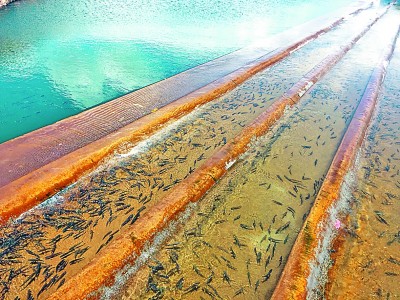 記者在沙柳河、泉吉河附近發(fā)現(xiàn),成群的湟魚聚集在敞開式過魚通道前,有的已經(jīng)率先拾階而跳,向產(chǎn)卵區(qū)進發(fā)。此外,還有不少在增殖放流站內(nèi)等待放流的湟魚,它們均由人工在河里采集魚卵并培育而來。