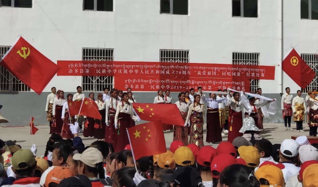 雜多縣第一民族中學(xué)的學(xué)生正在參加“慶祝中華人民共和國成立70周年”歌唱比賽活動。 本文受訪者供圖