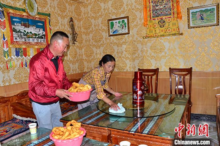 圖為8月20日扎西夫婦倆為客人準(zhǔn)備晚餐。 中新社記者 魯?shù)り?yáng) 攝