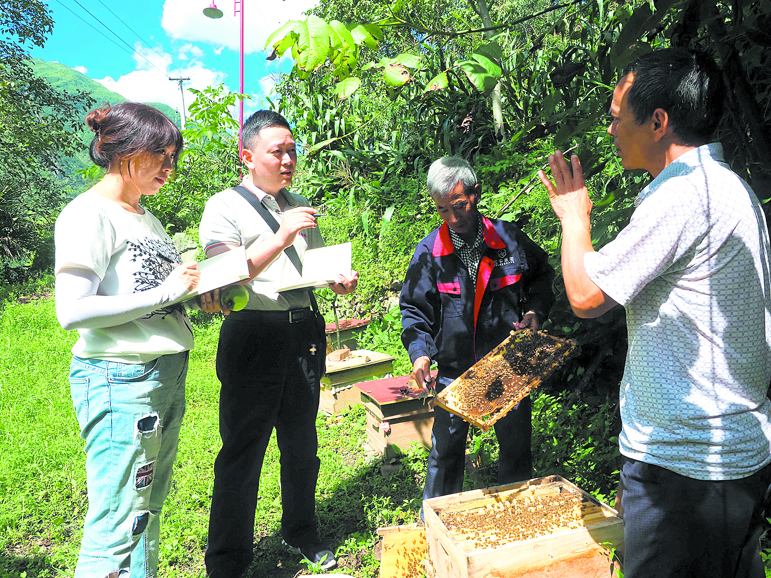 回轉(zhuǎn)身去,蒲江縣對口援助瀘定工作隊隊長吳孟賢正和張洪彬攀談著今年的蜜蜂增收情況?!捌呀h新增財政幫扶資金277萬元作為獎補資金,激勵成都三千米甜蜂業(yè)有限公司落戶瀘定發(fā)展的‘貢嘎中蜂’養(yǎng)殖支援項目,現(xiàn)在已經(jīng)累計發(fā)放貢嘎中蜂7500余群,幫助全縣38個貧困村發(fā)展村級集體經(jīng)濟,示范帶動800戶以上貧困戶增收?!眳敲腺t滔滔不絕如數(shù)家珍,身旁飛過的貢嘎中蜂也似乎成了他和其他對口支援隊員的化身,他們從舒適的成都平原來到高原瀘定,懷揣堅定的信念,用行動肩負起責任與擔當,他們將藏族同胞的利益裝在心里、舉過頭頂,排除千難萬險,因地制宜推動當?shù)匕l(fā)展;跋山涉水,進居入戶,訪貧問苦,為藏族同胞送上溫暖與關懷……他們用心血和汗水書寫著一個大大的“愛”字,甜到藏族同胞的心坎上。